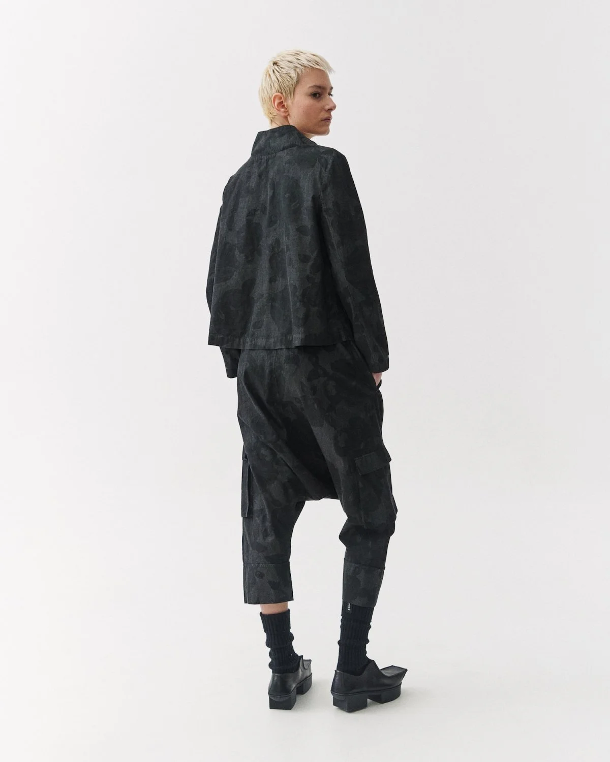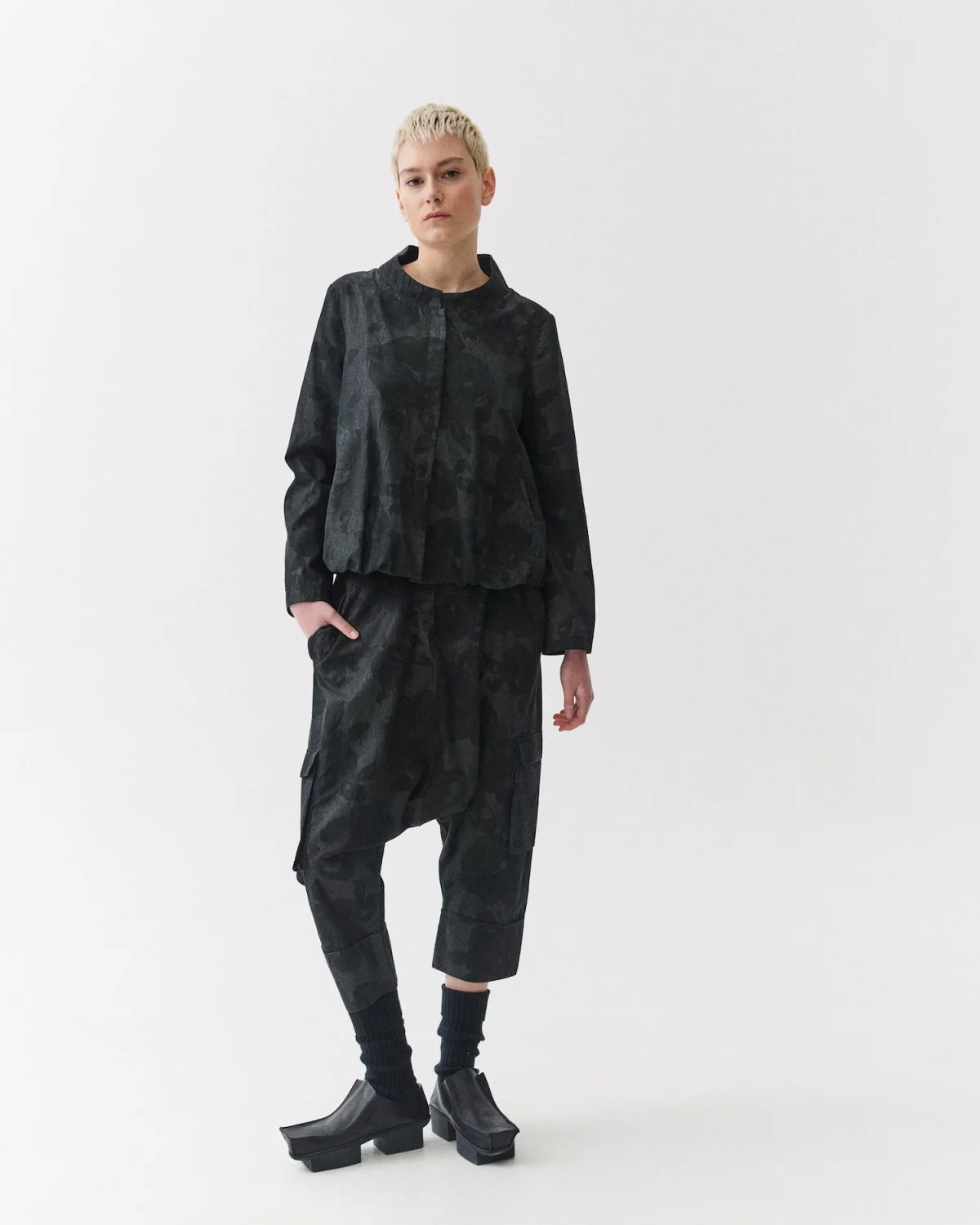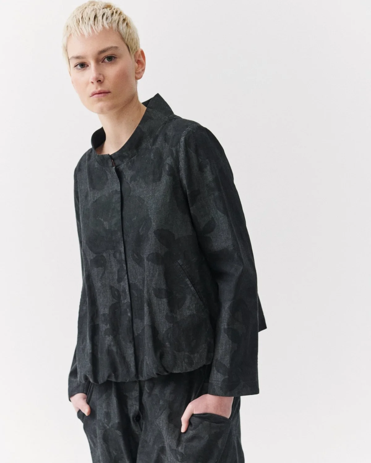 Cotton bomber jacket with a beautiful short stand-up collar. Subtle floral print & swing coat like style adding a feminine touch.