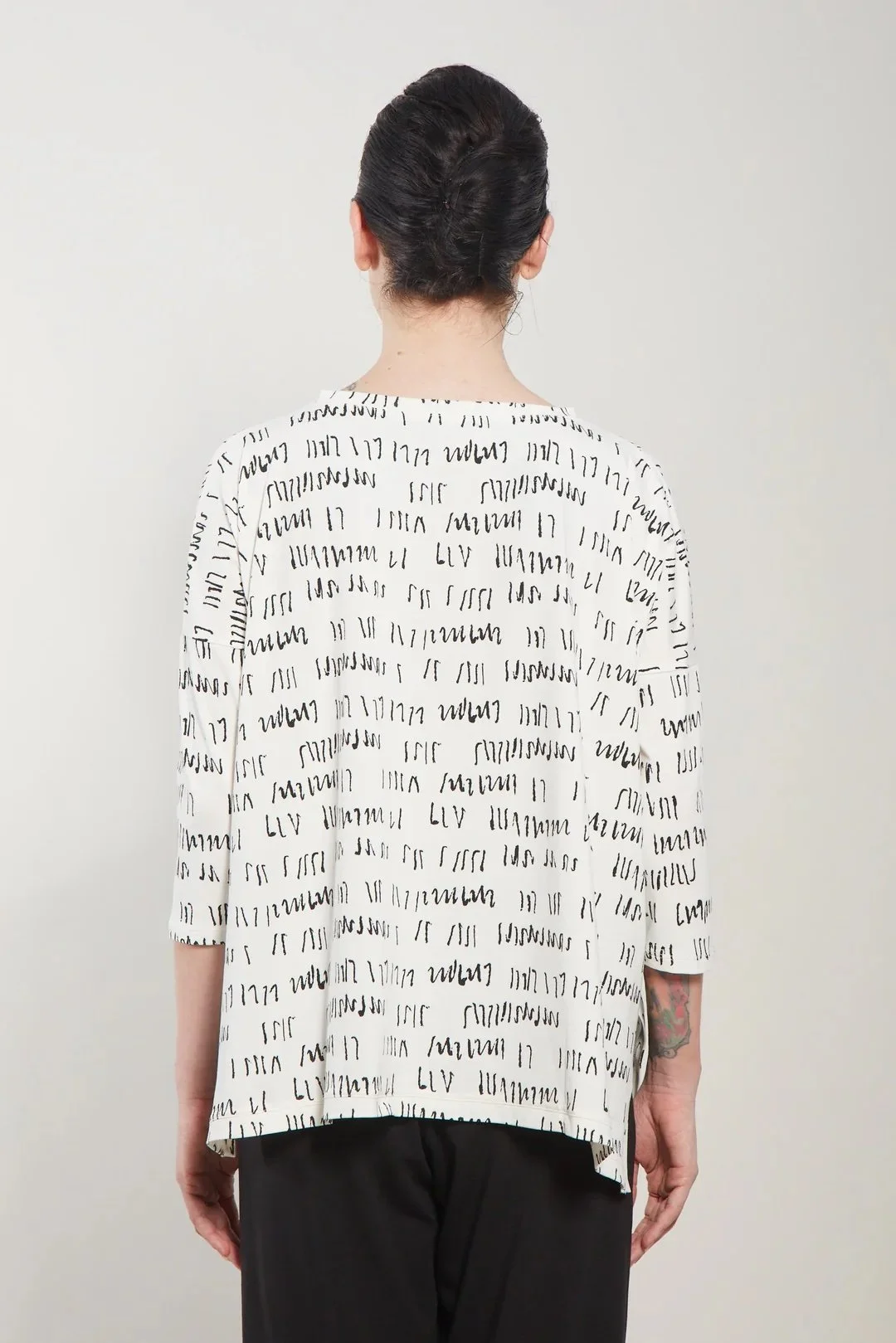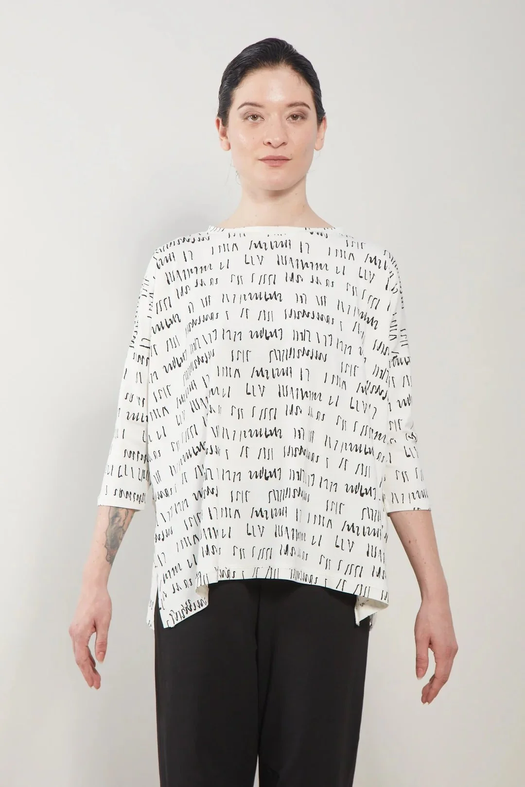 Historically our signature top, Karen is the easiest and most comfortable top in the collection. 3/4 sleeves and side slits make the boxy and easy fit Karen a wonderful compliment to any skirt or pant. In Cotton Lycrain our proprietary Script Print and solid Caribe, Seafoam, Ivory and Black, Karen takes a sublime shape to new heights. Be Kooler in Karen.