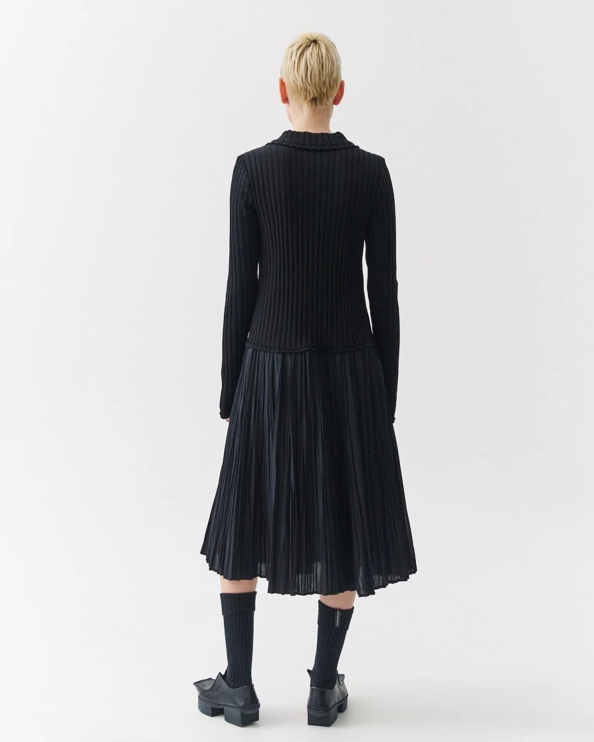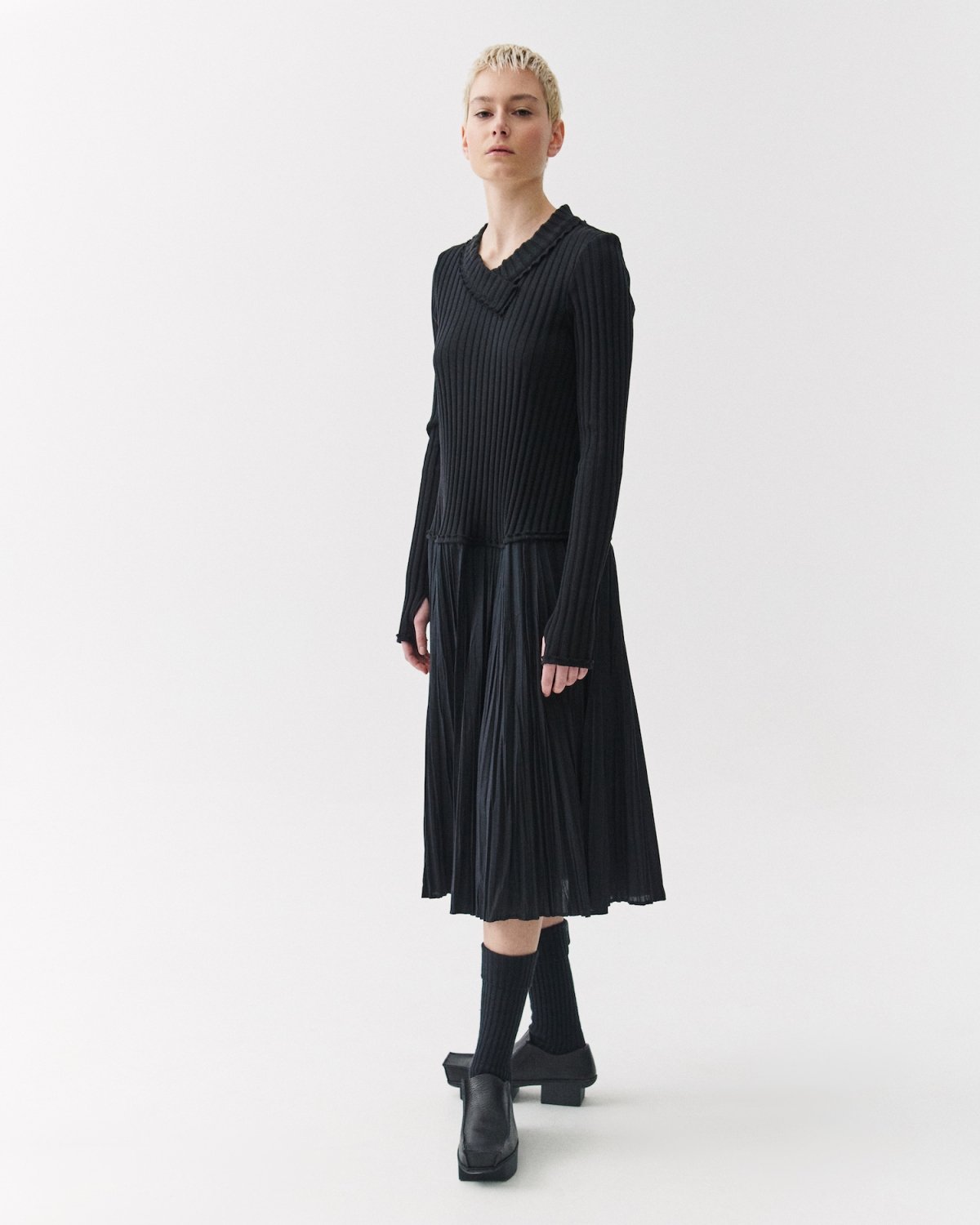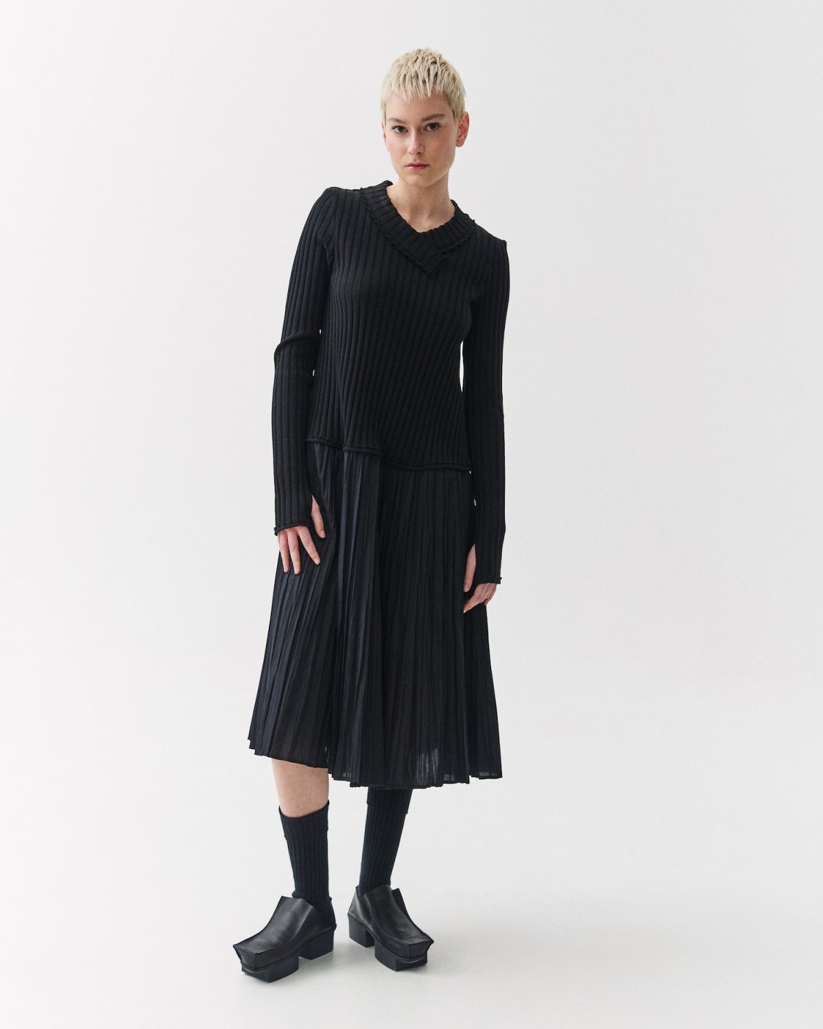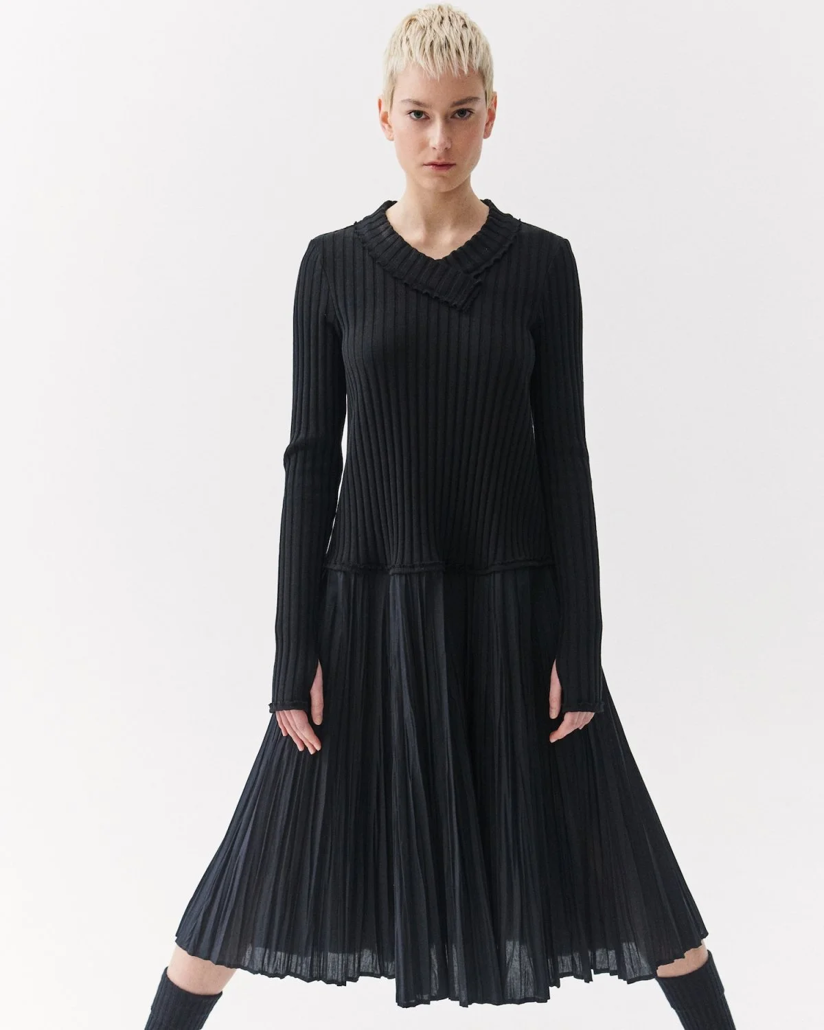 A classic yet stylish dress, with a v-neck elegant neckline and pleated skirt. Long sleeves have thumb holes for an easygoing edgy look.