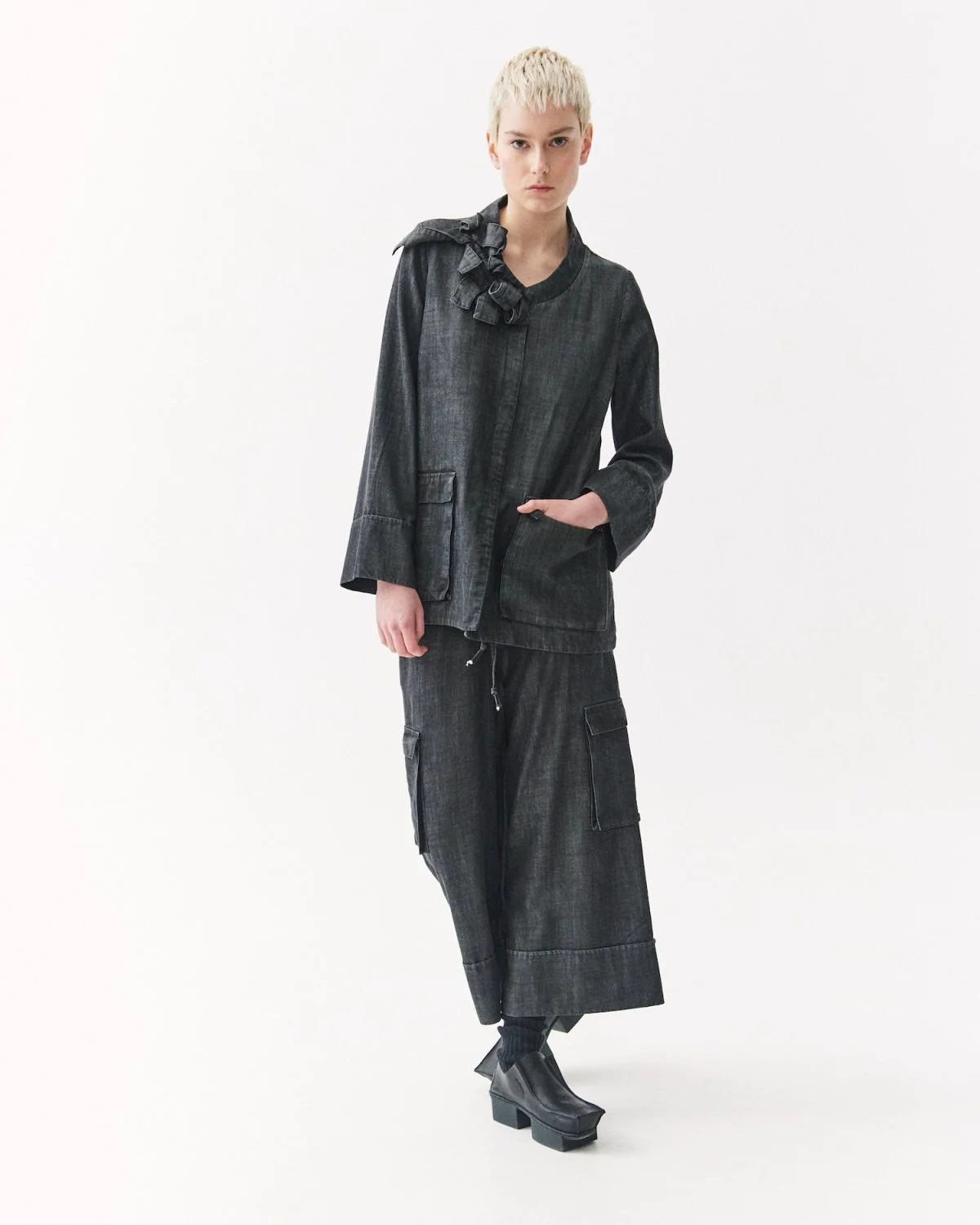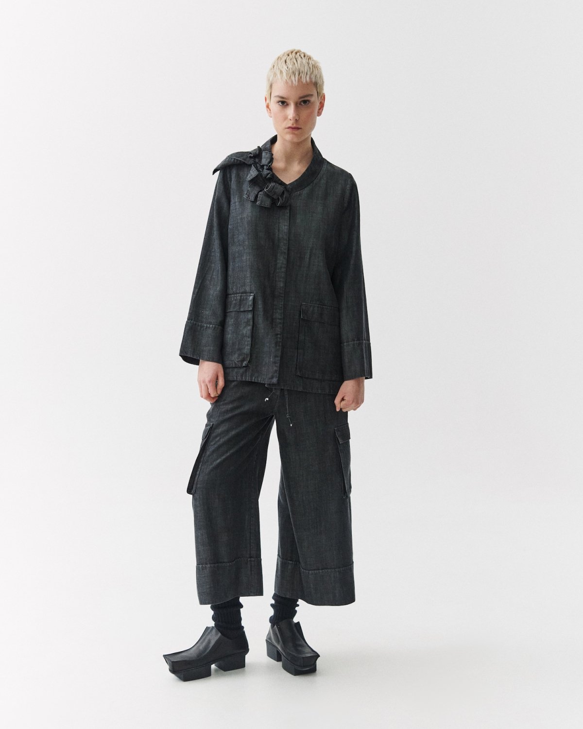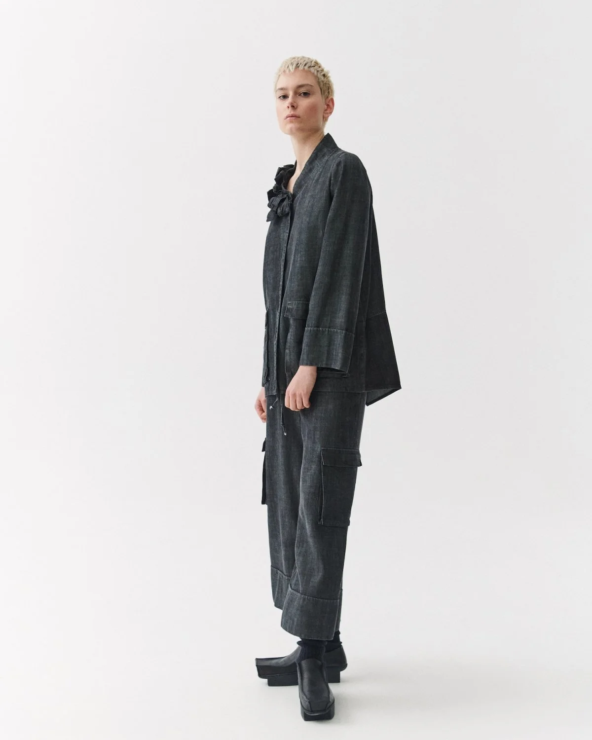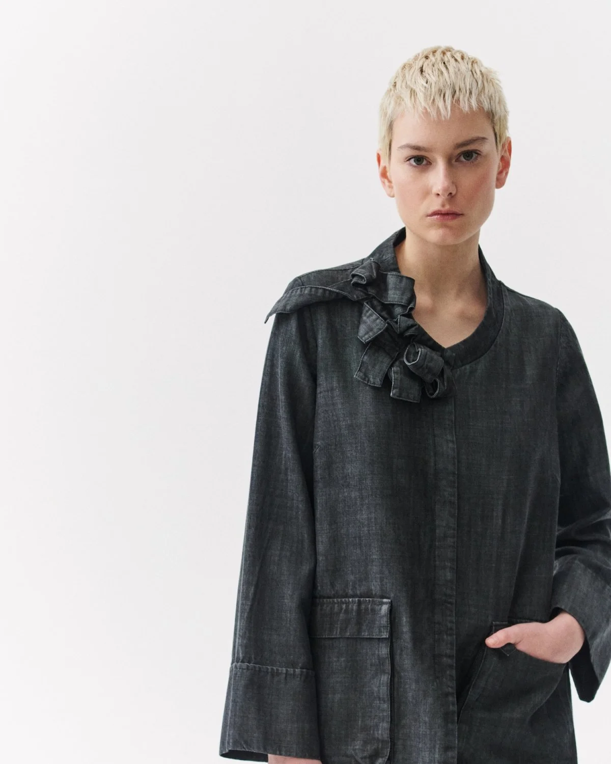 A unique take on a denim classic, this jacket features a fun detail around the neck line, wide kimono like sleeves and is made of a luxurious tencel fabric.