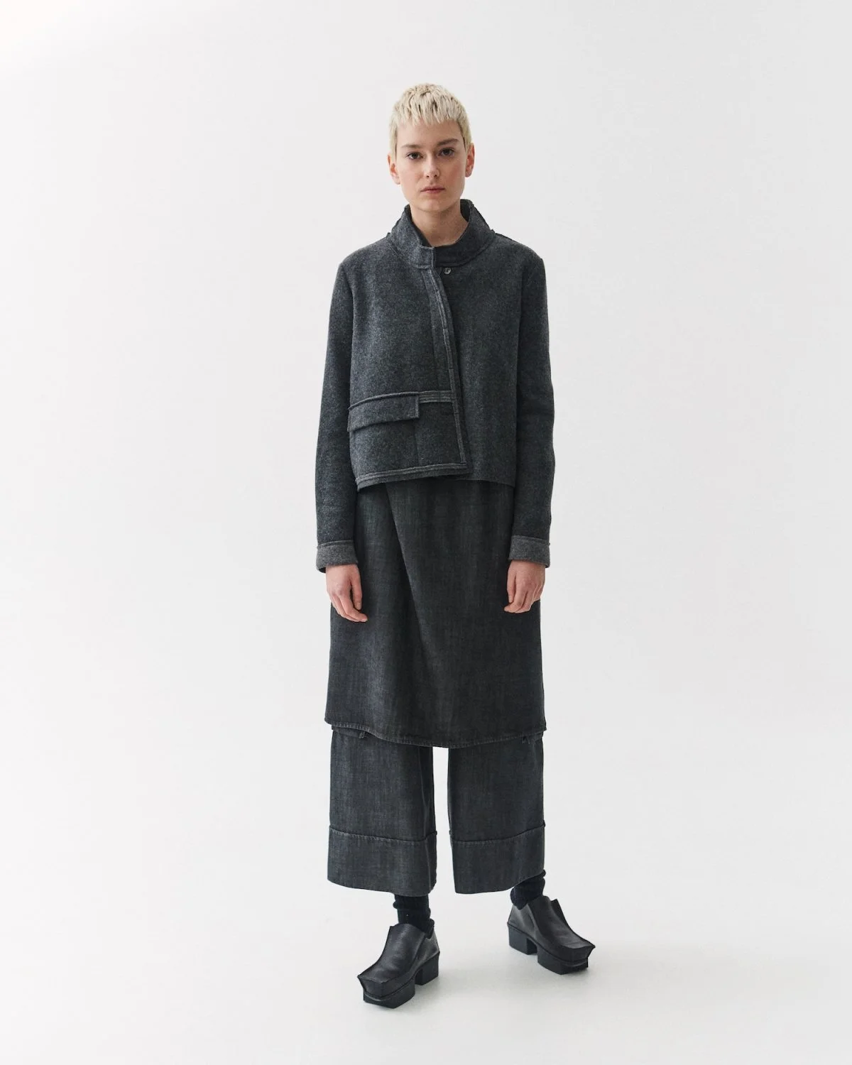 Wool jacket with an asymmetrical cut and decorative front pocket.