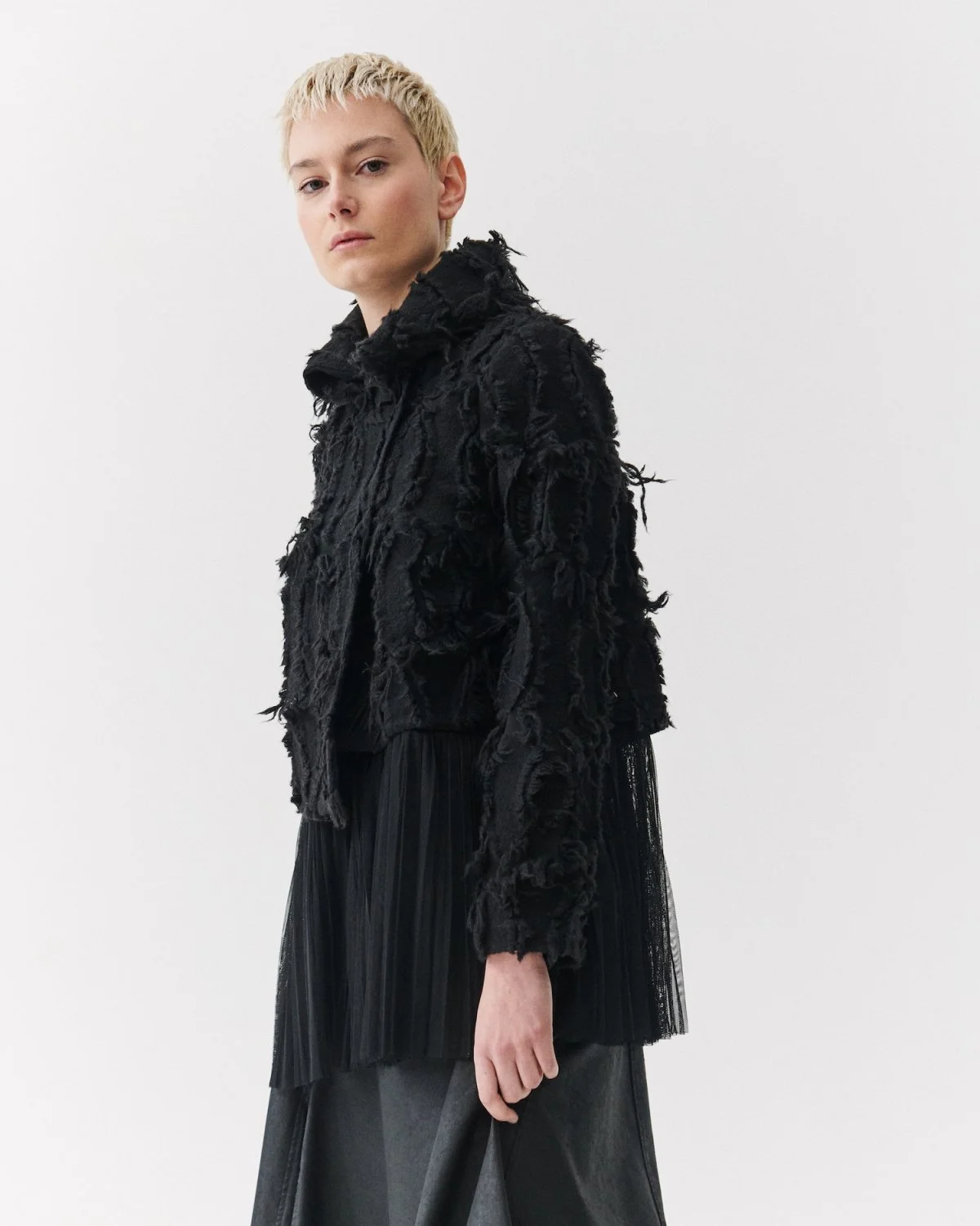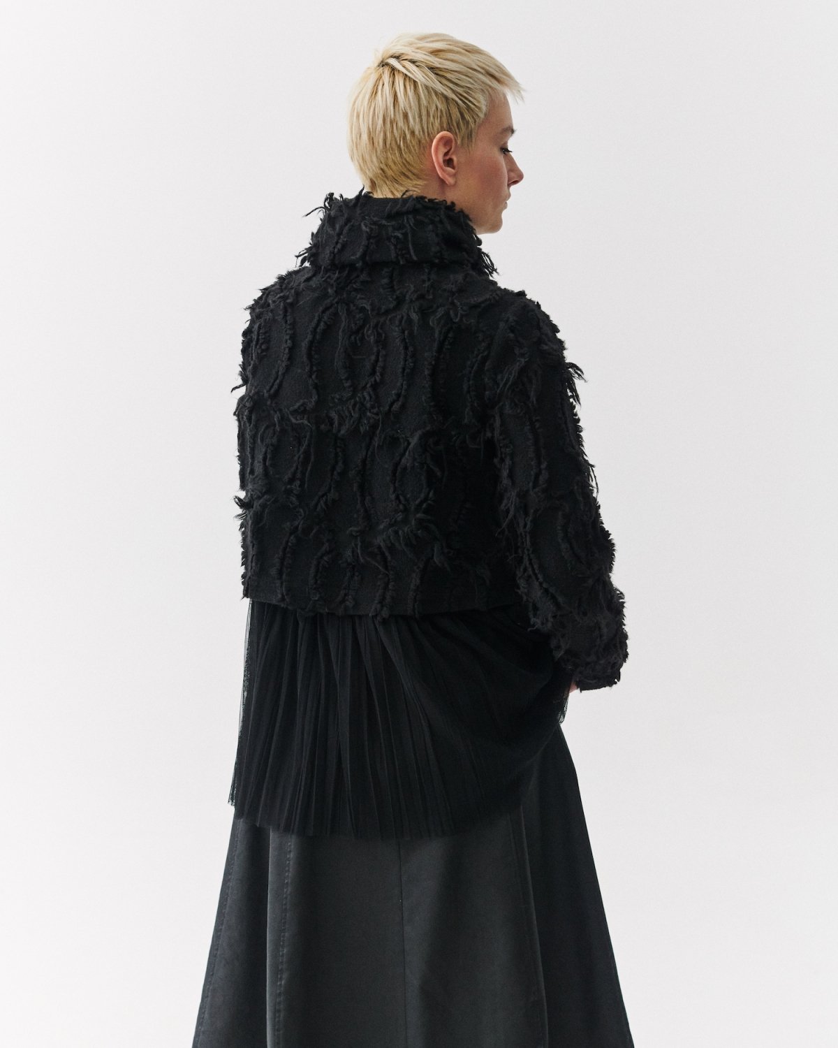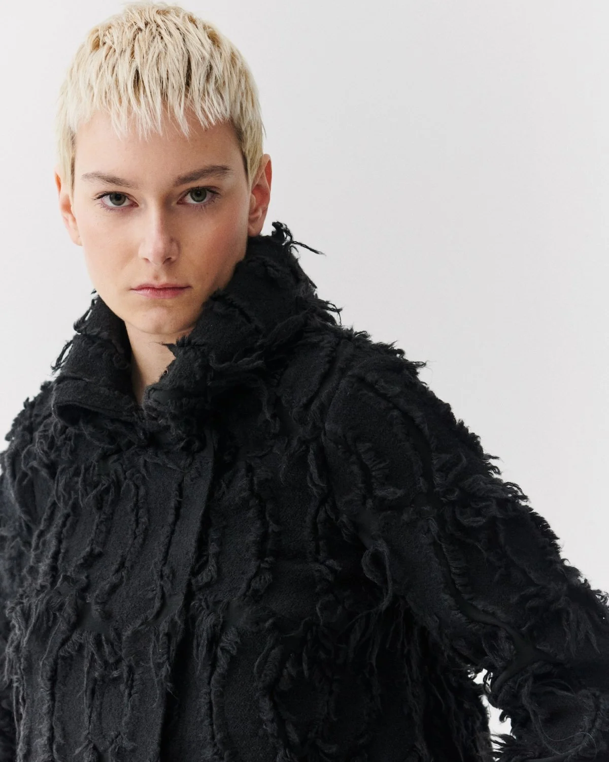 It features a high, rolled collar and asymmetrical fronts, a hit this season! You won't go unnoticed.