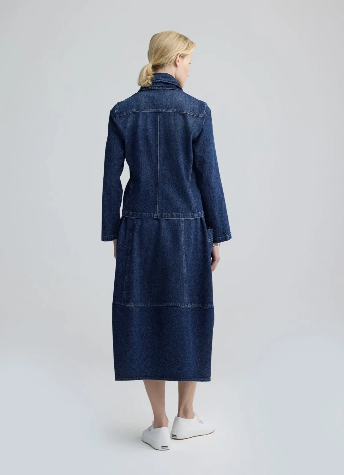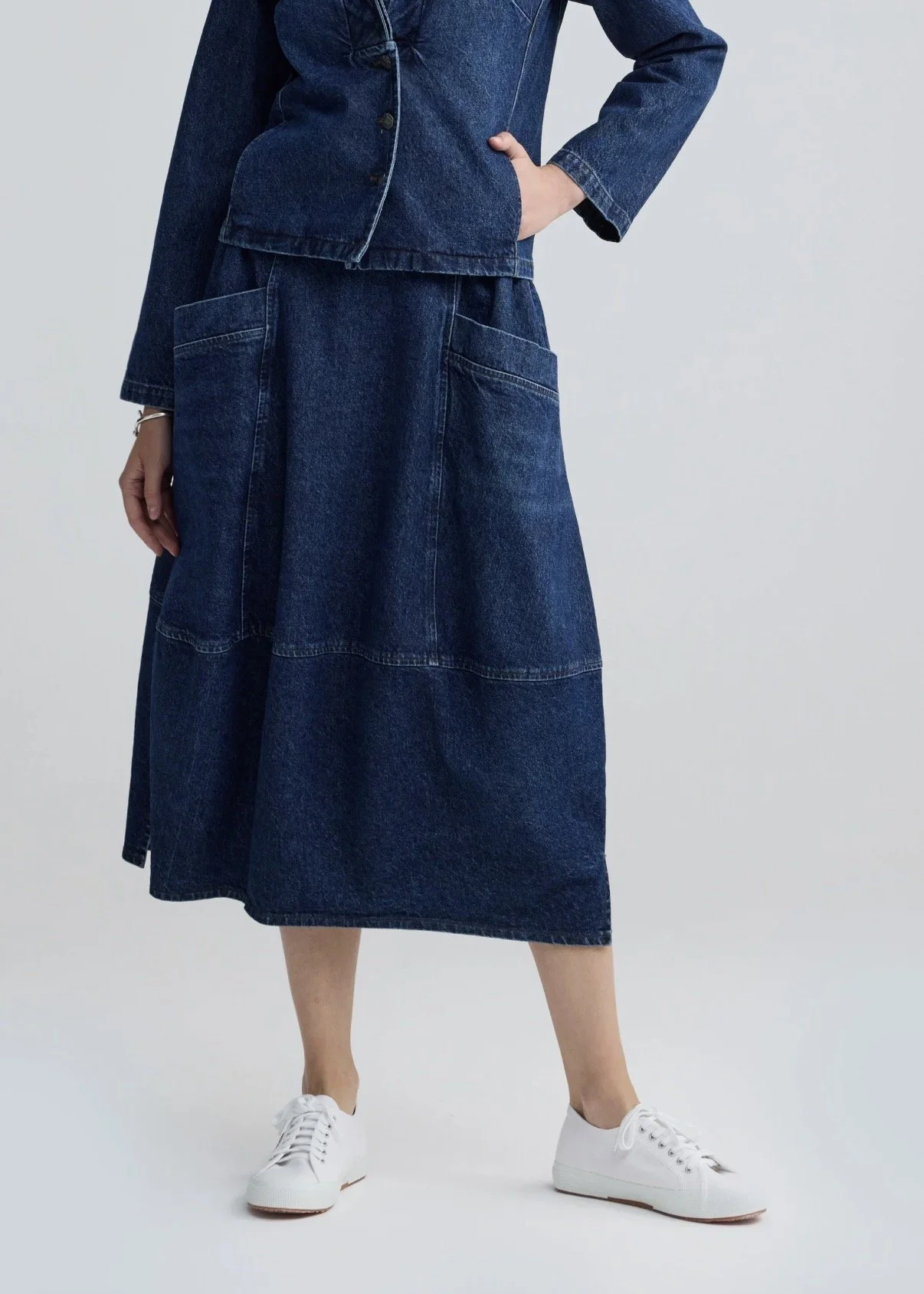 ✓ Voluminous midi skirt crafted from 100% structured indigo denim.