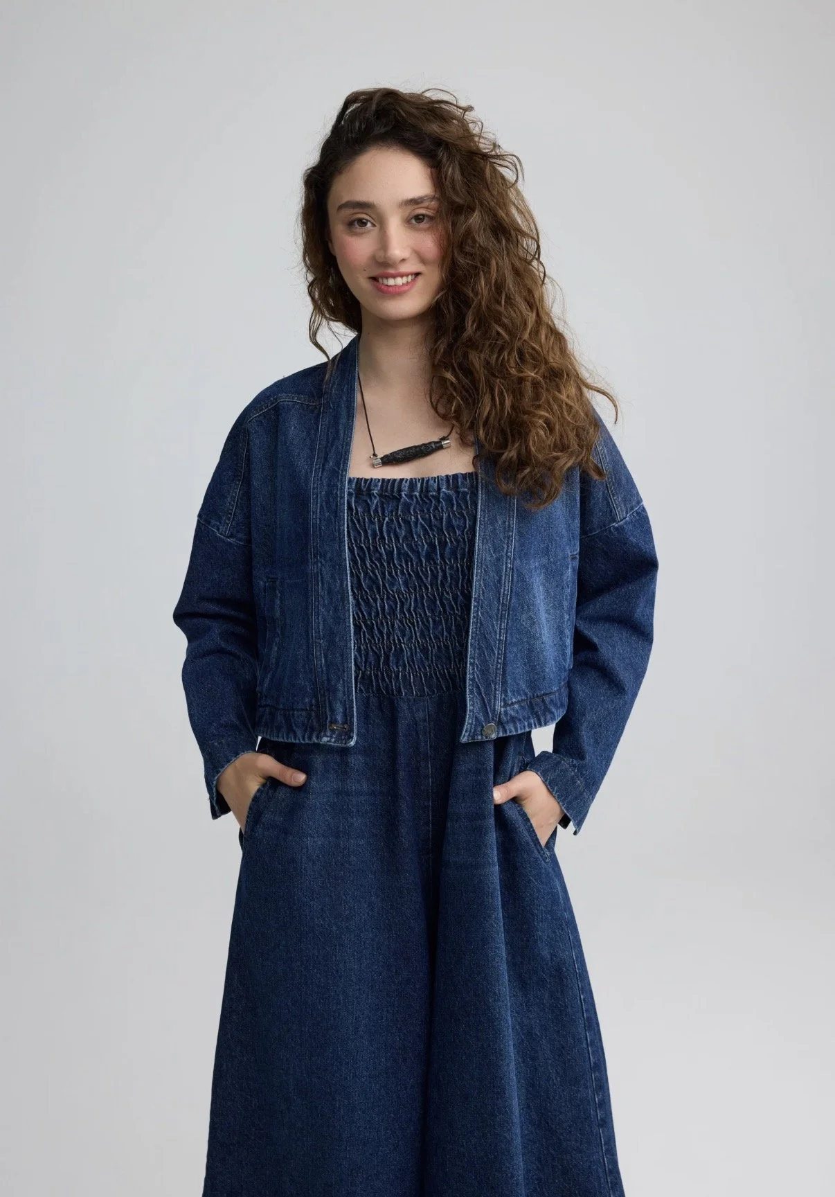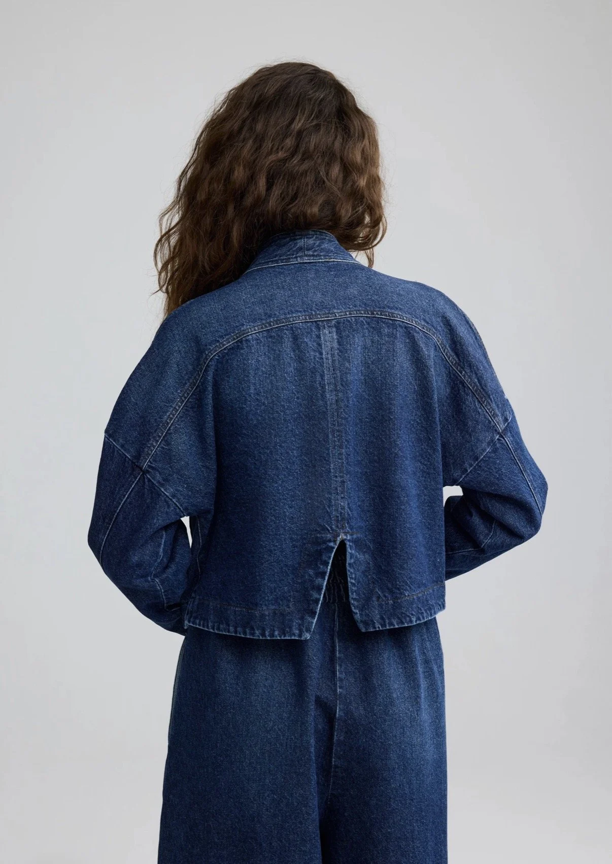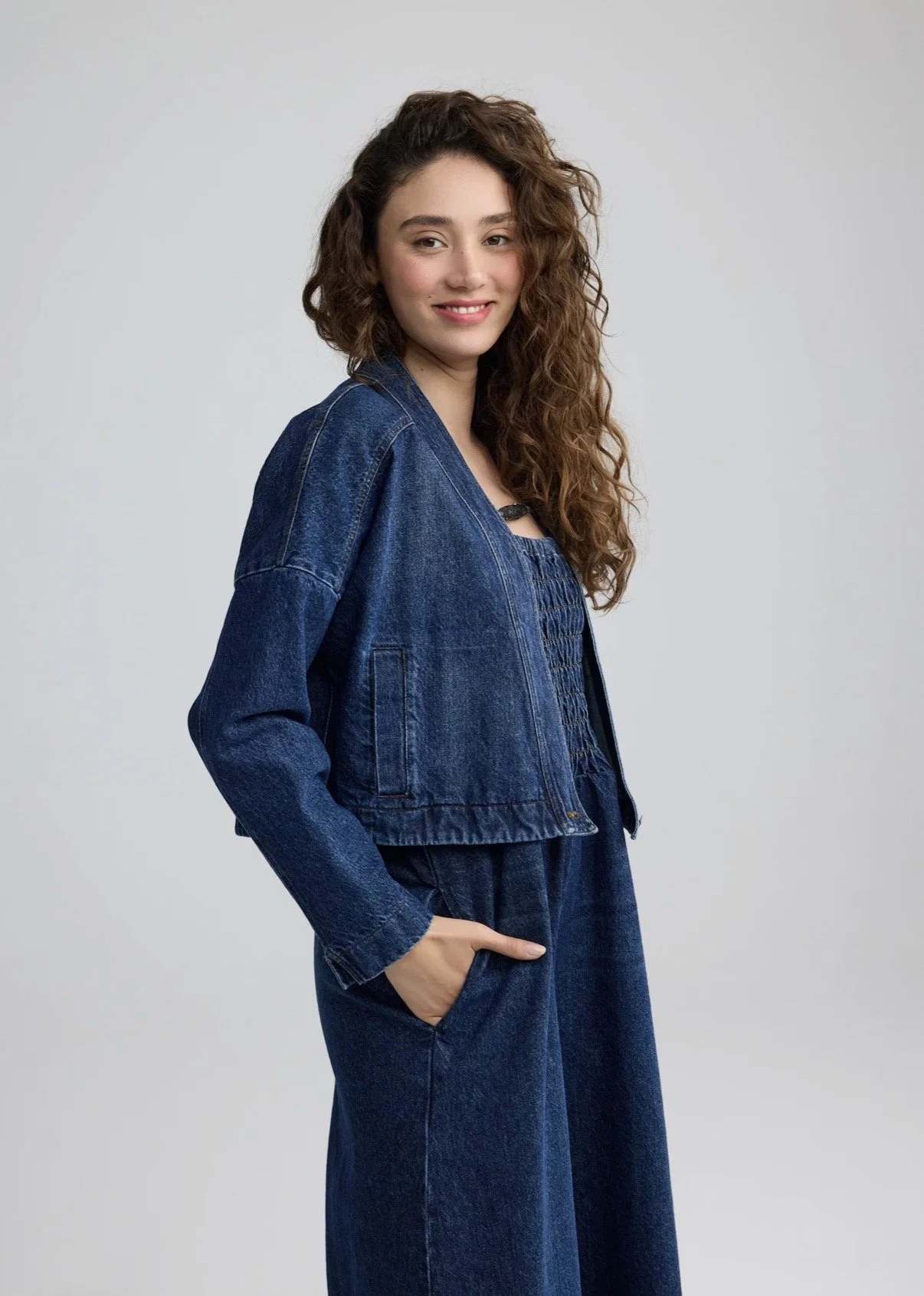 ✓ Artfully cropped jacket crafted from durable, high-quality 100% cotton indigo denim.